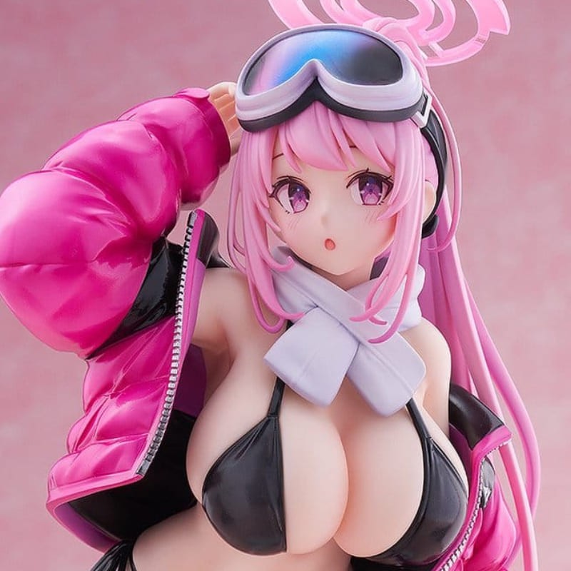 From the popular game 'Blue Archive' comes a 1/7 scale figure of Eimi, a member of the Super Phenomenon Task Force at Millennium Science School, in an eye-catching swimsuit! In her pursuit of efficiency (?), Eimi has embraced a bold outfit that perfectly embodies her signature style, paired with an effortlessly cool demeanor that is uniquely her own. A loose-fitting, billowing pink down jacket is casually draped over her shoulders. The contrast with her black bikini highlights Eimi's allure even further. No compromises were made in the sculpting, either. Details such as the soft-looking skin, the lustrous and wrinkled look of the jacket, and the scarf and goggles atop of Eimi's head have all been realized with great care. An interchangeable smiling face part is also included. Her gentle smile is a must-see for all fans! Add Eimi to your collection and experience her special Sensei-wowing winter moment for yourself!