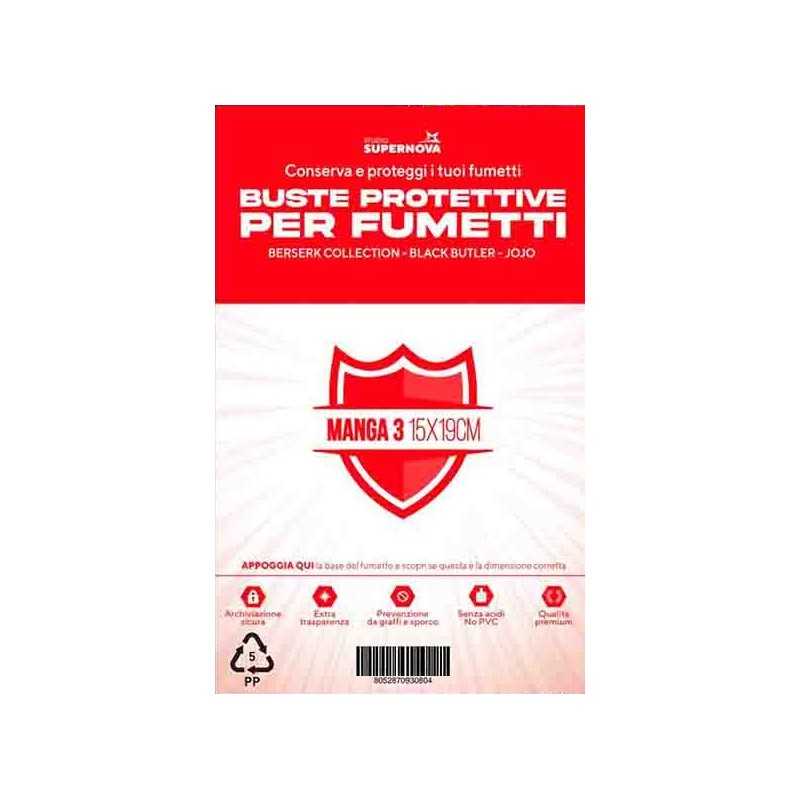 Le buste protettive Studio Supernova sono realizzate in Polipropilene neutro, un materiale plastico a basso rilascio di acidi, ideale per conservare fumetti ed articoli da collezione. Spesse poco più di 50 µm, sono resistenti ai graffi ed alle sedimentazioni di sporco (caratteristica che contribuisce a mantenere l'extra trasparenza delle bustine negli anni, combattendo l'effetto opaco). Ogni confezione contiene 100 bustine omologate per archiviare agevolmente fumetti delle rispettive misure spessi fino a 3,8 cm, e presentano apertura dall'alto con patella richiudibile con relativa striscia adesiva.