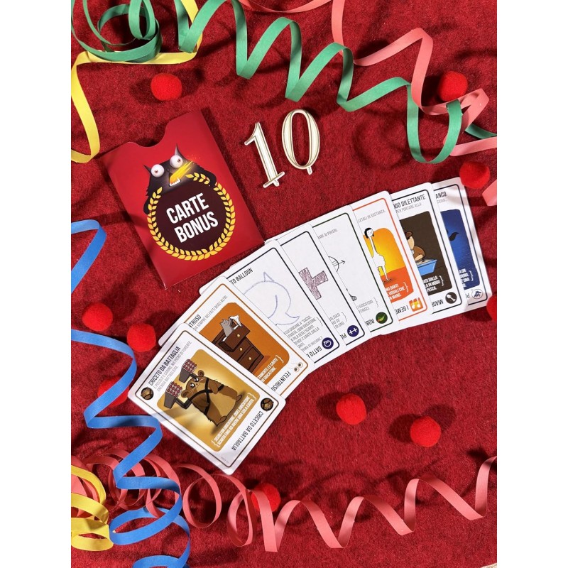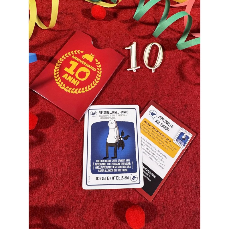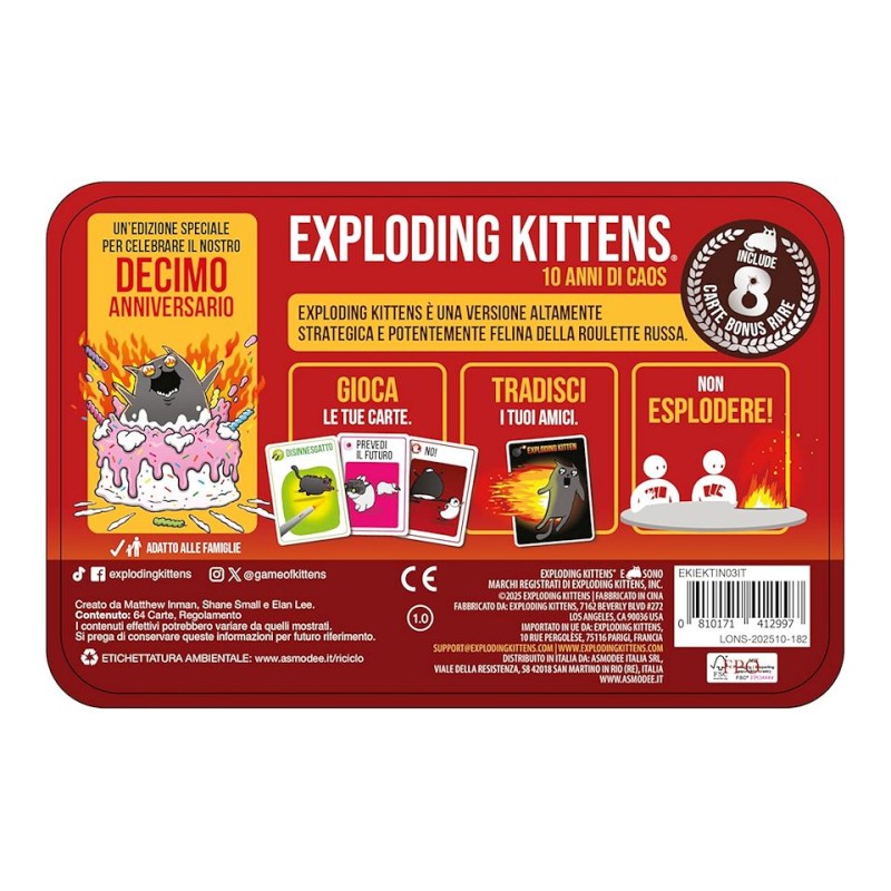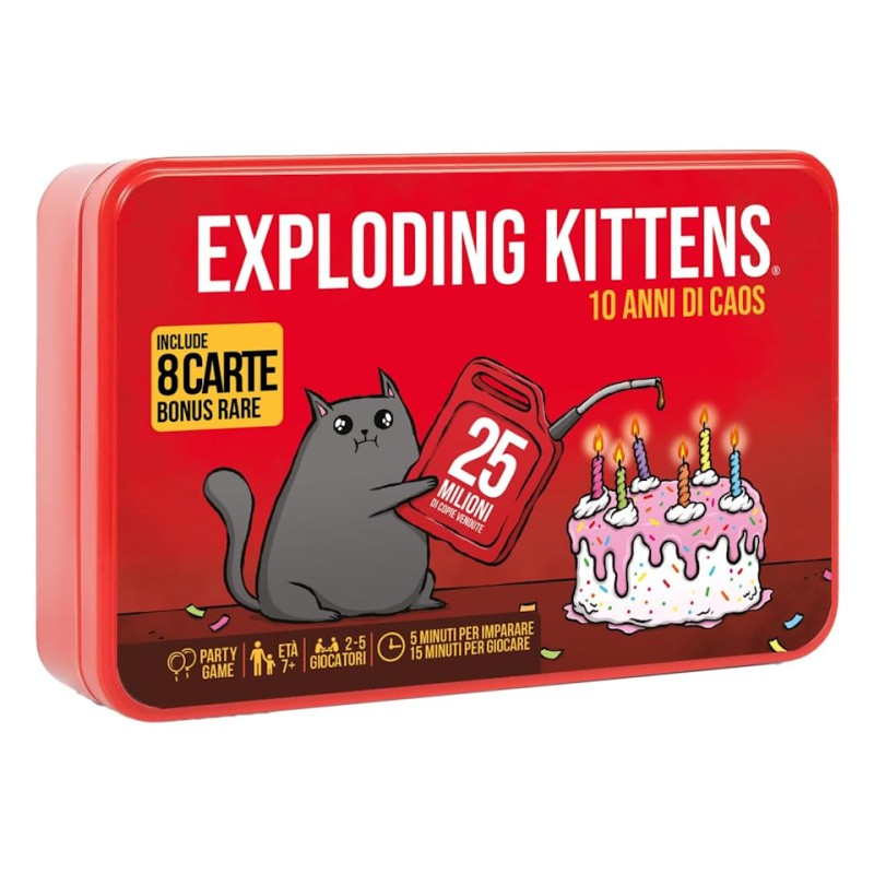 Un'edizione speciale per celebrare il decimo anniversario di: Exploding Kittens! Come? Con lo stesso gioco che vi ha fatto innamorare, in una più elegante e resistente scatola in latta e ben 8 carte bonus rare, introdotte in espansioni passate ma ormai fuori catalogo.