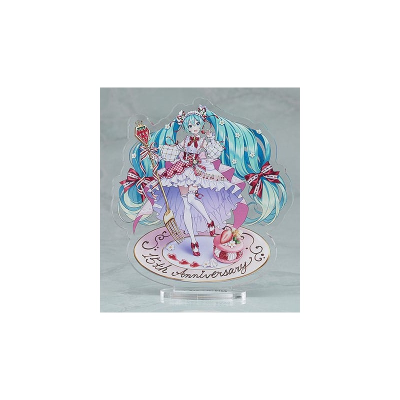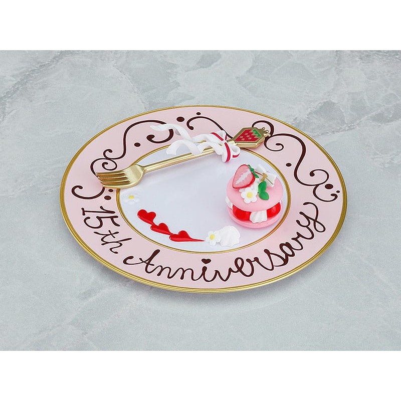Hatsune Miku appare in un nuovo completo a tema fragola per il suo 15° anniversario! L'illustrazione del progetto della figure del 15° anniversario di En Morikura è stata trasformata in un Nendoroid! Ha 3 volti intercambiabili: uno standard, uno sorridente e uno di beatitudine soddisfatta. Le parti opzionali includono una forchetta a tema fragola, una base per la figure che sembra un piatto di dessert e un delizioso macaron!