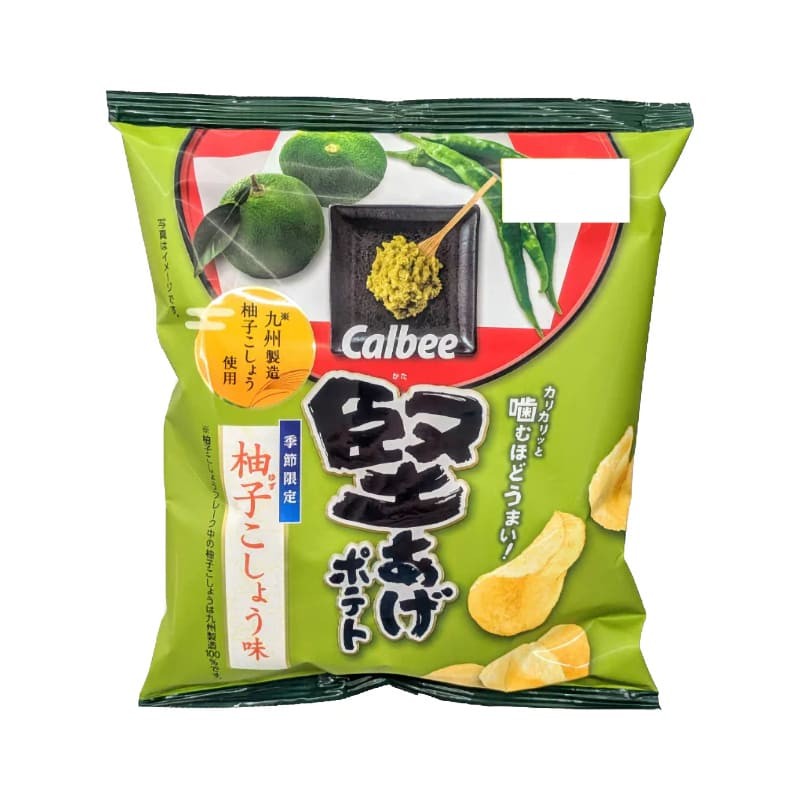 Ingredienti: Patata, olio vegetale, sale, fiocchi di peperoncino yuzu, destrina, zucchero, amido, proteine idrolizzate (SOIA), polvere di estratto di pollo, polvere di pepe giapponese, estratto di lievito fermentato in polvere, succo di yuzu in polvere, peperoncino in polvere / glutammato monosodico (E621), aromi, acidificante (acido citrico), estratto di spezie, dolcificante (stevia), antiossidante (vitamina C).